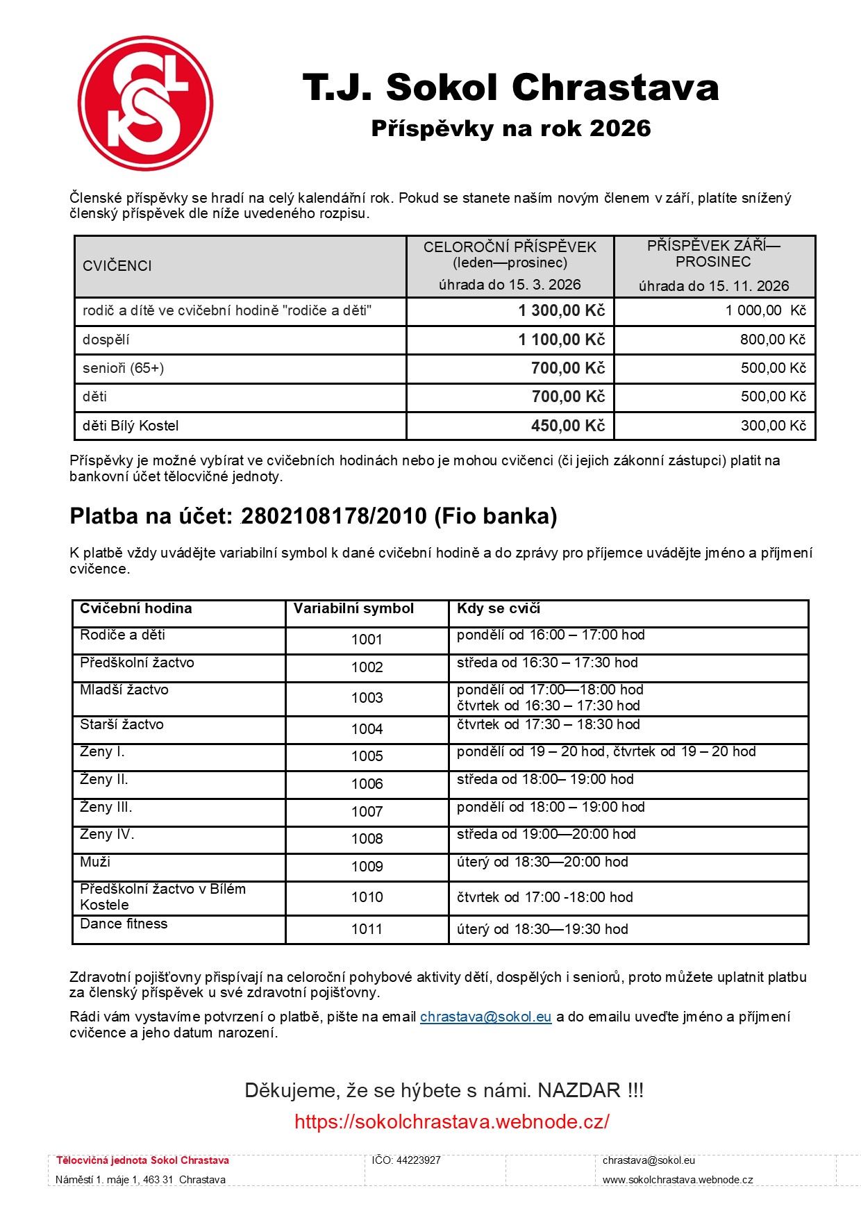 Příspěvky mohou cvičenci platit ve cvičebních hodinách nebo je mohou (či jejich zákonní zástupci) platit na bankovní účet tělocvičné jednoty.