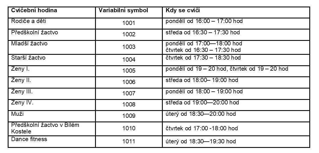 K platbě uvádějte vždy variabilní symbol k dané cvičební hodině (níže soubor ke stažení s těmito symboly) a do zprávy pro příjemce uvádějte jméno a příjmení cvičence.